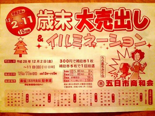 あきる野市五日市 レストラン洋食キッチン シオンの陽一です。 五日市商和会「歳末大売出し&イルミネーション」が今年も12月2日(金)より始まります。 売出し日は11日(日)までの十日間です。 今年も抽選会が行われます。 期間中、五日市商和会の大売出…