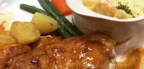 あきる野市五日市のレストラン、洋食キッチンシオンの陽一です。今日は蒸し暑かったですね。夜になってもまだ暑いです。二十四節気の「処暑(しょしょ)」です、そろそろ暑さもピークでしょうか。写真はおすすめセットメニューの「若鶏のソテー生姜風味&海…
