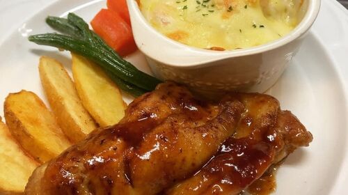 あきる野市五日市のレストラン、洋食キッチンシオンの陽一です。けっこう降ってましたね。夜中から結局夕方くらいまで降っていたでしょうか。明日は晴れる予報で気温も上がる様です。写真はおすすめセットメニューの「若鶏のソテー生姜風味&海老マカロニグ…