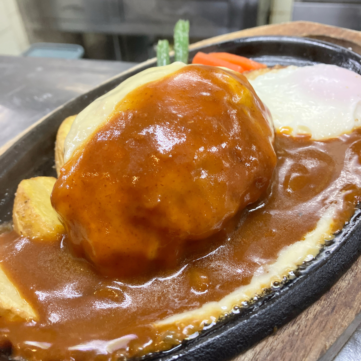 国産の合挽き肉を使用したハンバーグは手仕込み、手捏ねで作っています。