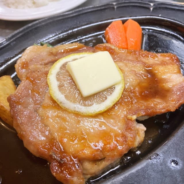 2024-12-27 鉄板厚切りポークソテー オニオンソース レモンバター添え おすすめセットメニュー あきる野市五日市のレストラン、洋食キッチンシオンの陽一です。今日が仕事納めの方が多いでしょうか。一年お疲れ様でした。シオンは29日(日)まで、私は30日の大掃除で納めです。写真はおすすめセットメニューの「鉄板厚切りポークソテー オニオンソース レモンバター添え」です。国産豚ロース肉のソテーになります。自家製ソースで味付けしてレモンバターを添えています。ミニサラダとスープ、ライスorパンが付いてランチタイムは1,870円です。▲鉄板厚切りポークソテーオニオンソースレモンバター添え。五日市のレストラン 洋食キッチン シオンhttp://www.kitchen-sion.com