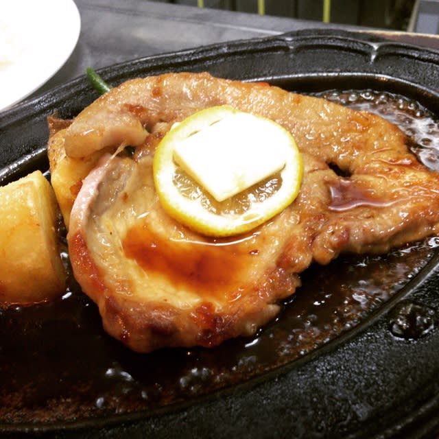 写真はおすすめセットメニューの「鉄板厚切ポークソテー オニオンソース レモンバター添え」です。