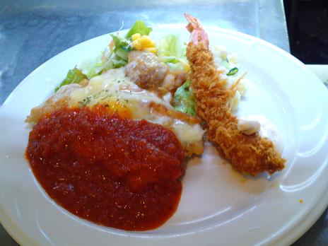 ▲若鶏のソテートマトソースとろけるチーズ添え&天然エビフライ。