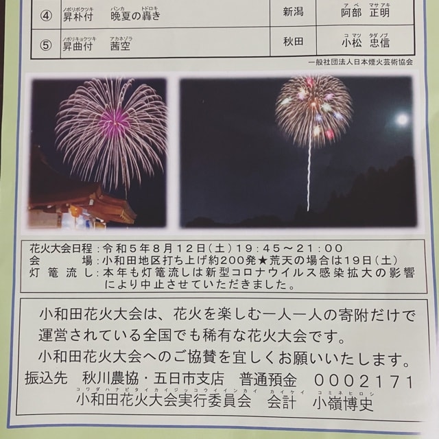 2023-08-11 第22回小和田花火大会 五日市 あきる野市五日市のレストラン、洋食キッチンシオンの陽一です。明日8月12日(土)は小和田の花火大会が開催されます。心配だった天気も大丈夫そうですね。19:45から打ち上げ開始になります。今年も一尺玉を含む約200発が打ち上がります。観るのはもちろん、山に響く音も楽しめます。▲第22回小和田花火大会のパンフレット。五日市のレストラン 洋食キッチン シオンhttp://www.kitchen-sion.com/