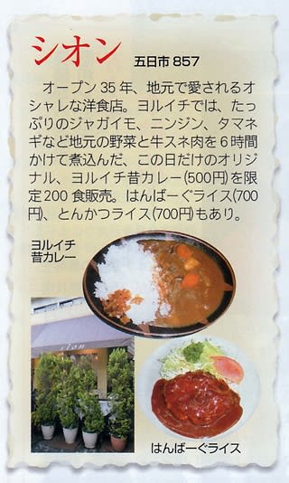 2012-07-08 ヨルイチの特集 五日市 あきる野市五日市 レストラン洋食キッチン シオンの陽一です。 せっかくの週末なのですが天気が良くないですね。 日曜日も雨の予報です。 早く梅雨が明けるといいですね。 多摩地区の読売新聞に折り込まれる、多摩西部読売会さん発行の情報紙「よみうりサンタマリアwith婦人公論」の7月号で五日市のヨルイチが特集されます。 シオンの記事も載っています。 お店にもおいてありますので是非ご覧下さい。 ▲よみうりサンタマリア。 ▲シオンの記事。 五日市のレストラン 洋食キッチン シオンhttp://www.kitchen-sion.com/
