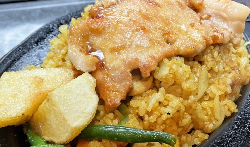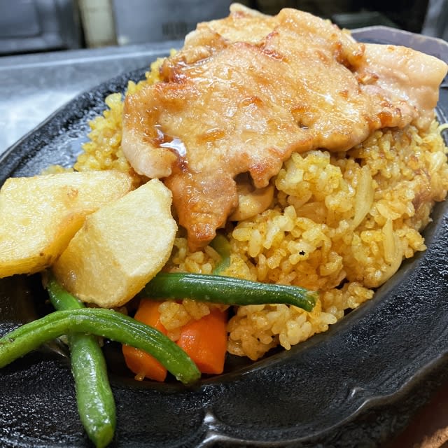 ドライカレーに焼肉をのせた熱々鉄板の料理になります。