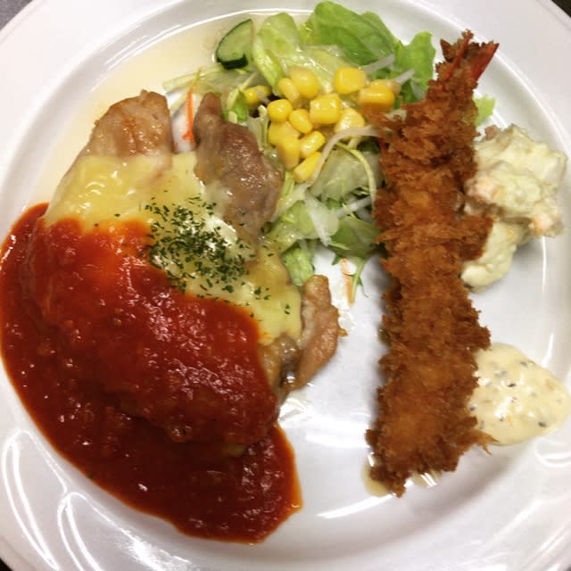 ▲若鶏のソテー トマトソース とろけるチーズ添え&天然海老フライ。