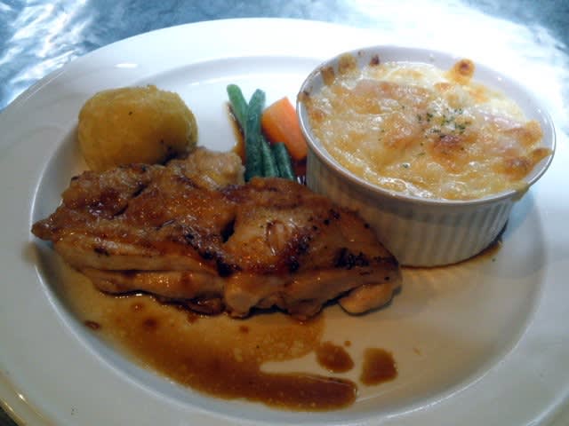 写真はおすすめセットメニューの「若鶏のソテー生姜風味&エビマカロニグラタン」です。