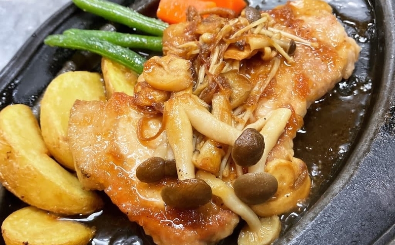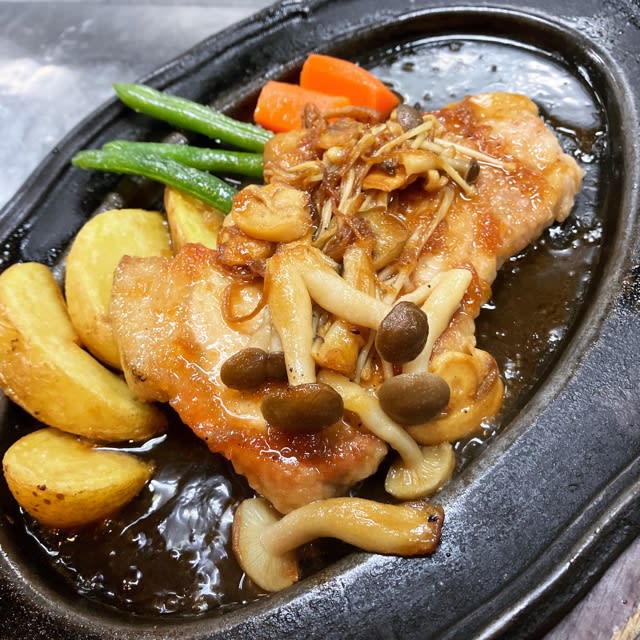 写真はおすすめセットメニューの「鉄板厚切りポークソテー 和風きのこソース」です。